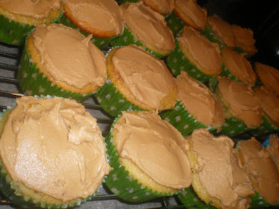 Ok, back to the cupcakes. Decadent, delicious, wonderful cupcakes. I have no other name for them that's why the title is so long...but I shall call them...Monkey Nuts as this is a favorite saying of my hubs. Plus these flavors are sometimes associated with monkeys....besides the bananas, I don't really see why. Anyway, they were awesome, delicious, and even better after being refrigerated! I apologize if the recipe seems scattered as it literally went something like this "Oh! I have cake mix! Cupcakes! OH! And I have chocolate chips! I'll throw those in. Oh! And how about a mashed banana! With Peanut butter frosting!" So...sorry....but they're great!!